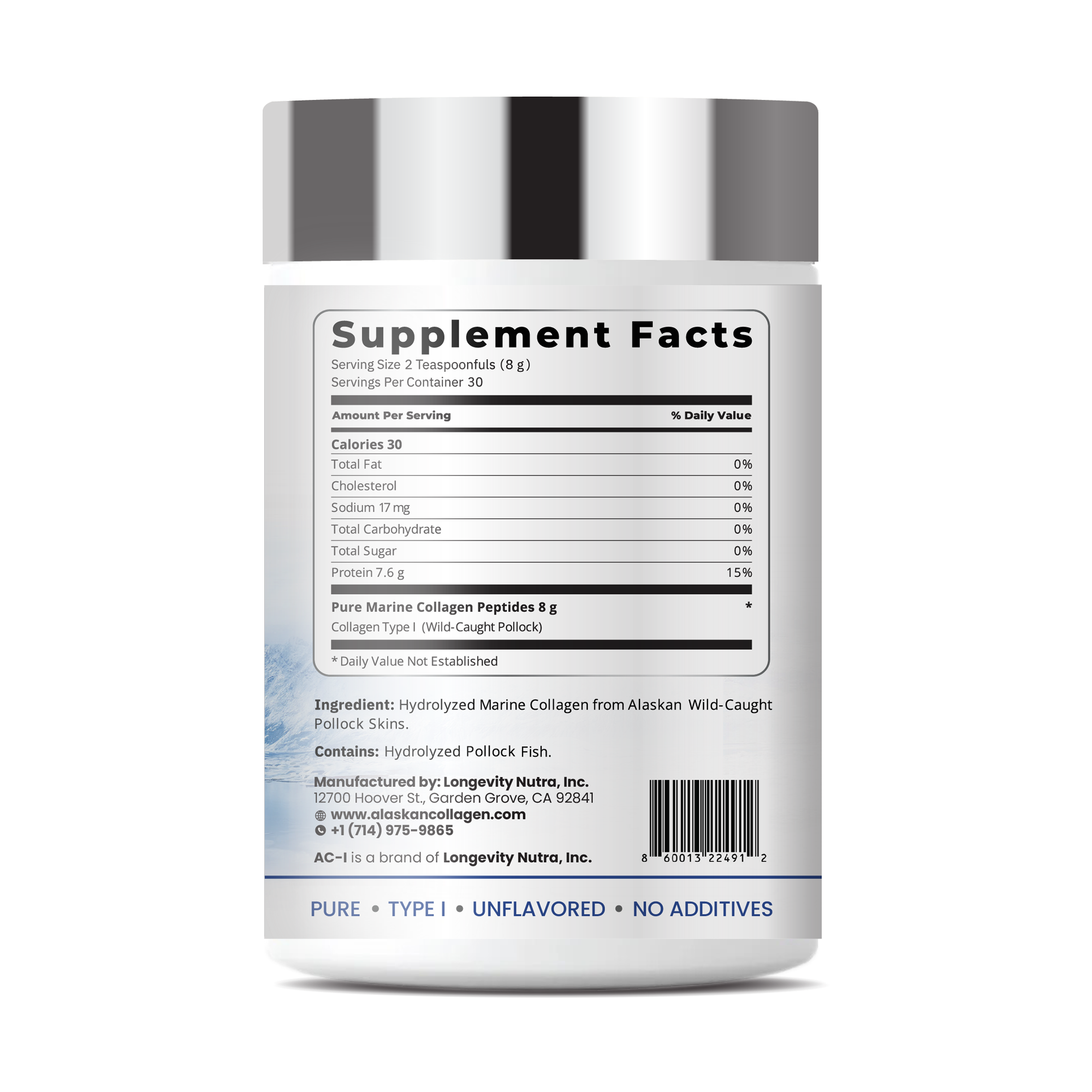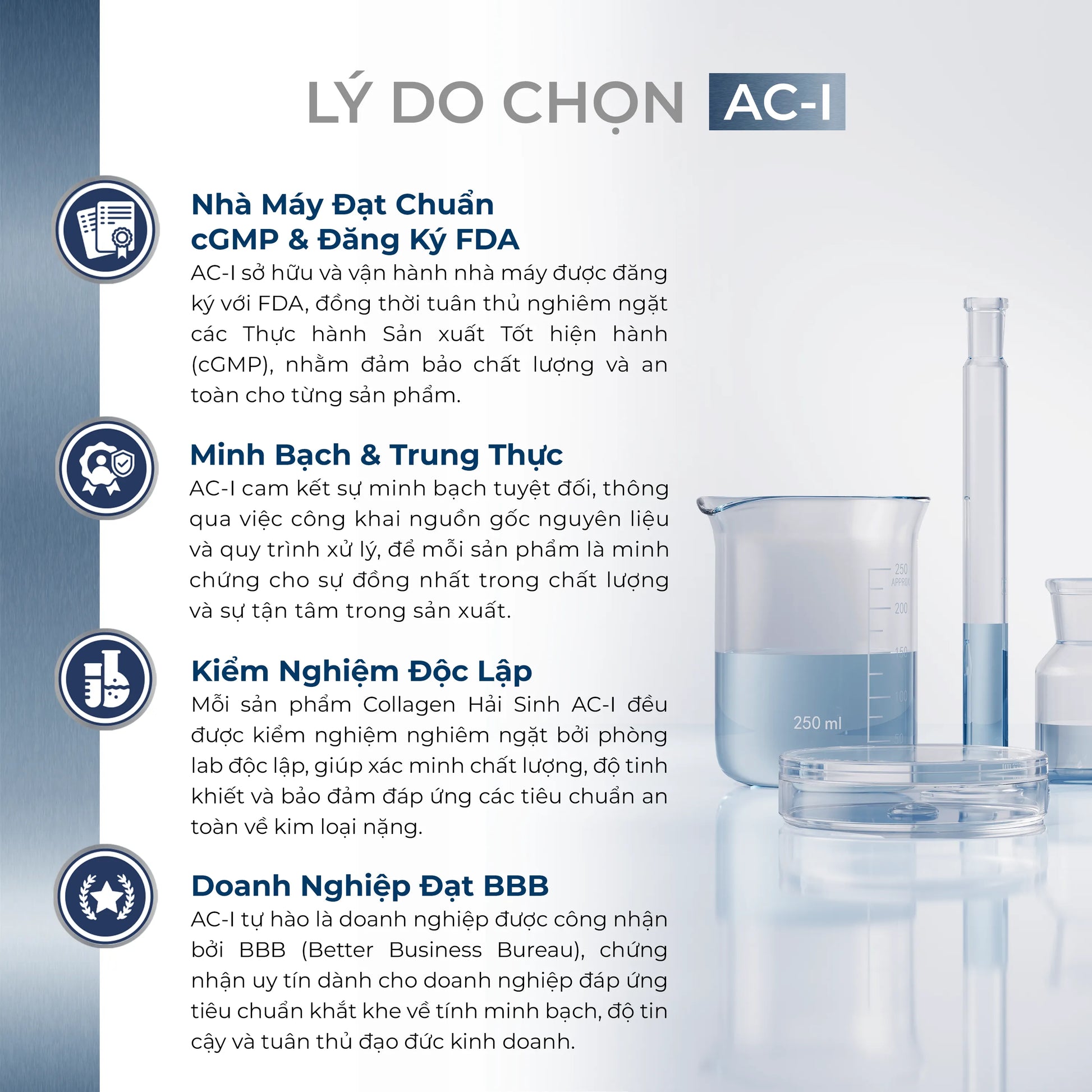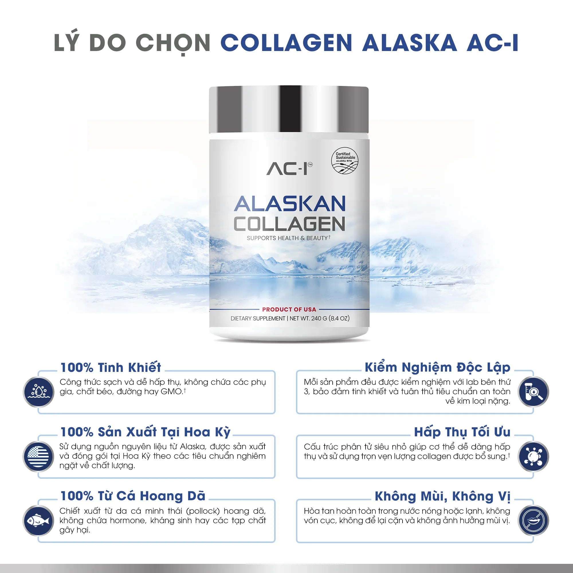 Toàn bộ quy trình đánh bắt, chế biến và đóng gói đều được thực hiện tại Hoa Kỳ theo tiêu chuẩn nghiêm ngặt, nhằm đảm bảo collagen của AC-I đạt chất lượng và độ tinh khiết tuyệt đối, không chứa kim loại nặng hay các tạp chất gây hại.