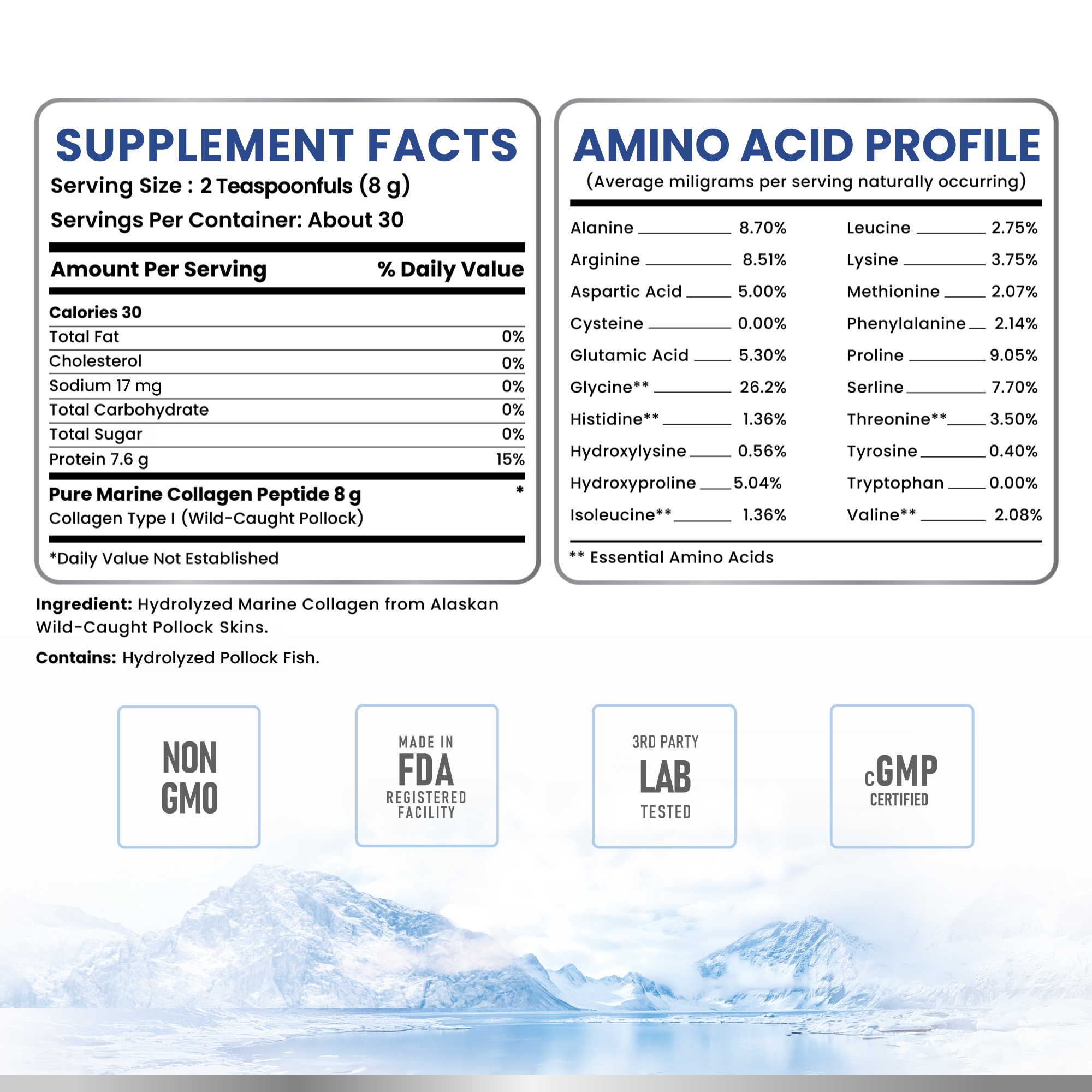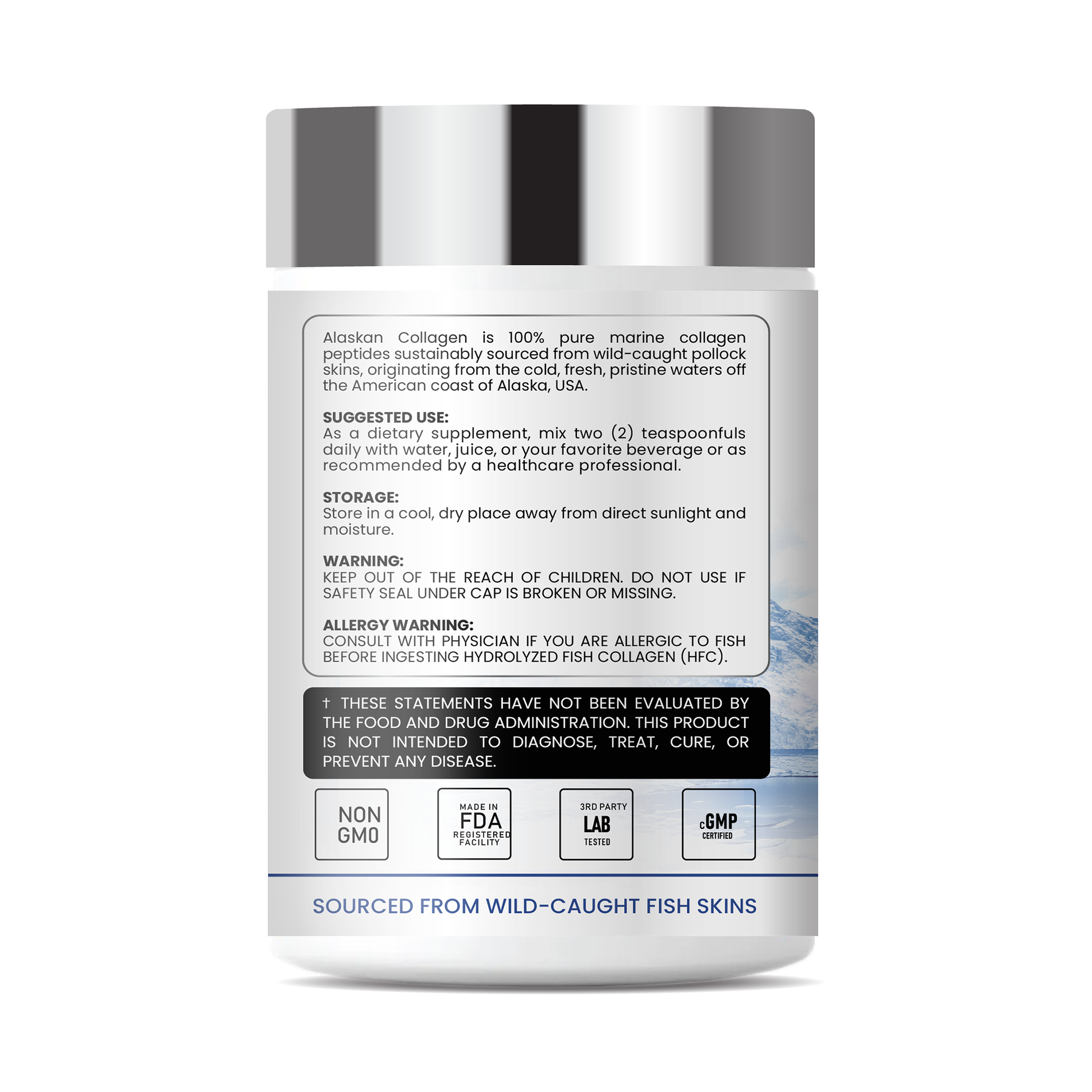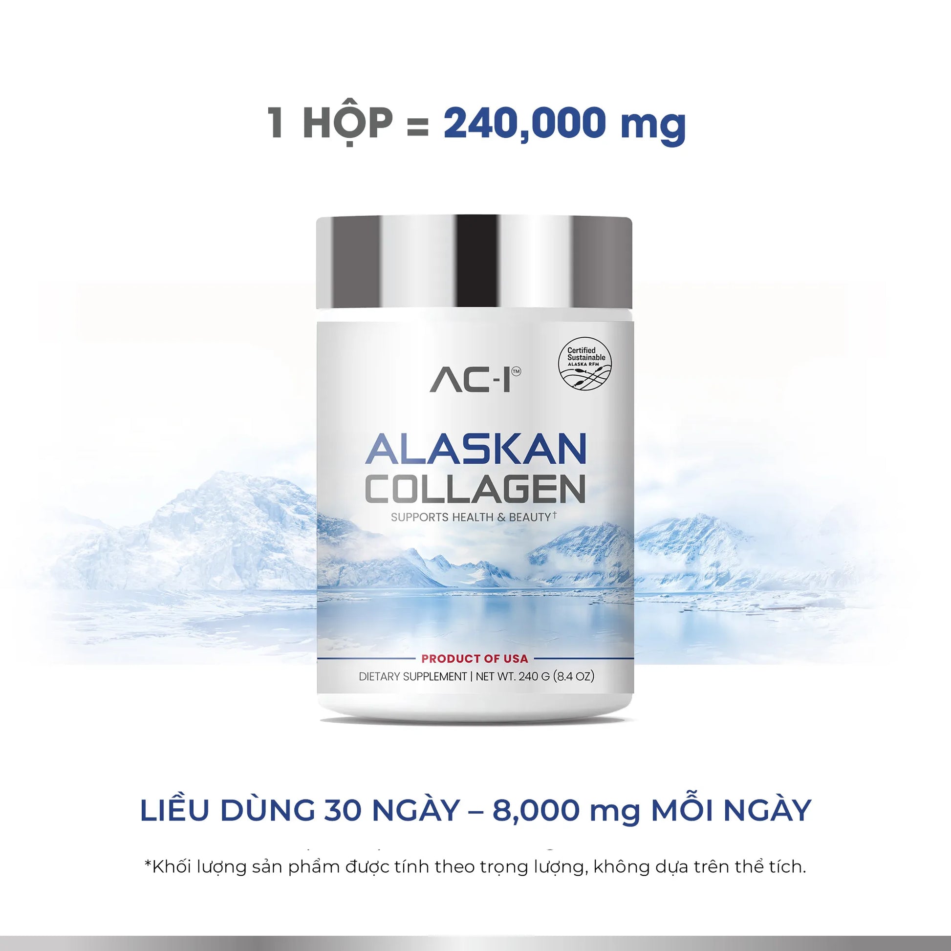 Collagen Alaska AC-I là Collagen Hải Sinh tinh khiết 100%, được chiết xuất từ nguồn da cá tươi sạch, đánh bắt tự nhiên tại vùng biển sâu, băng giá ngoài khơi Alaska, nơi có thiên nhiên nguyên sơ và hệ sinh thái biển giá trị bậc nhất Hoa Kỳ.